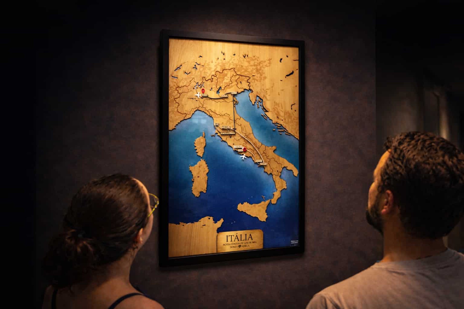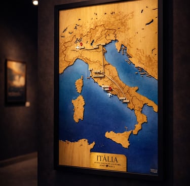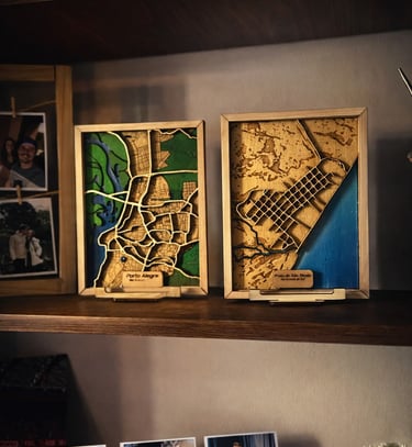 Criamos mapas decorativos autorais, feitos em madeira e acrílico, que transformam viagens, cidades e trajetos marcantes em peças únicas.