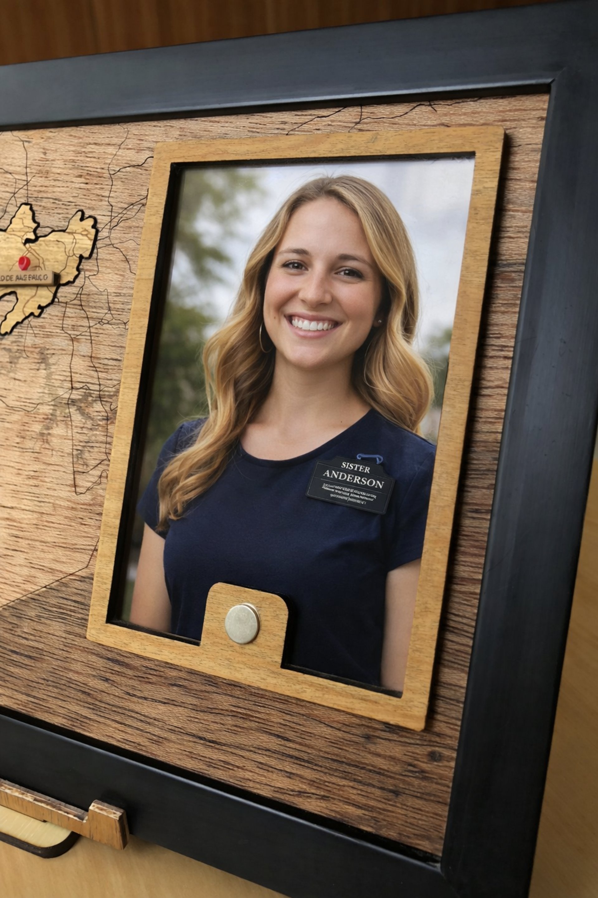 O quadro inclui espaço para sua foto oficial e um lugar para fixar própria plaquinha